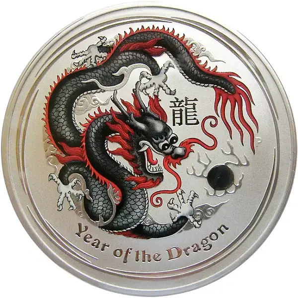 Der Drache gilt im chinesischen Tierkreiszeichen als Symbol für Glück, Stärke und Wohlstand. Das Design von 2012 zeigt das mythische Wesen, das eine „Perle der Weisheit“ jagt. Während die Standard-Silbermünze rein metallisch glänzt, hebt die Color-Applikation die Schuppenstruktur und die Dynamik des Drachen besonders hervor und macht die Münze zu einem echten Blickfang.