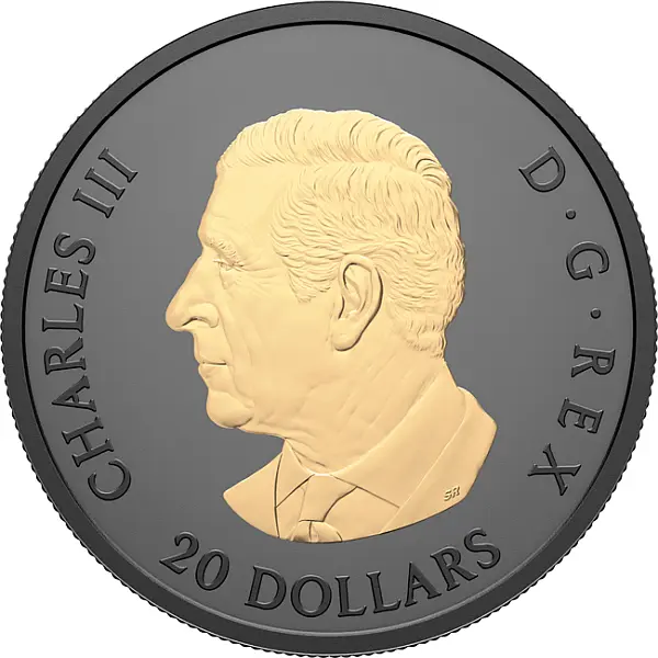 Die Prägequalität in Matte Proof (mattierte Platte) unterstreicht die feinen, tief ziselierten Details der Ahornblatt-Struktur. Auch die Effigie (das Porträt) Seiner Majestät König Karl III. auf der Vorderseite ist für ein harmonisches Gesamtbild selektiv vergoldet und mit schwarzem Rhodium umrahmt.