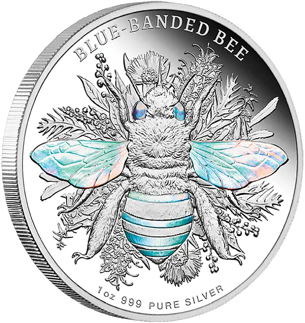 Von der 1-Unzen-Silbermünze „Australian Native Bees – Blue-banded Bee“ (2025) mit Hologramm-Prägung „Proof“ werden maximal 1.000 Exemplare ausgegeben.
